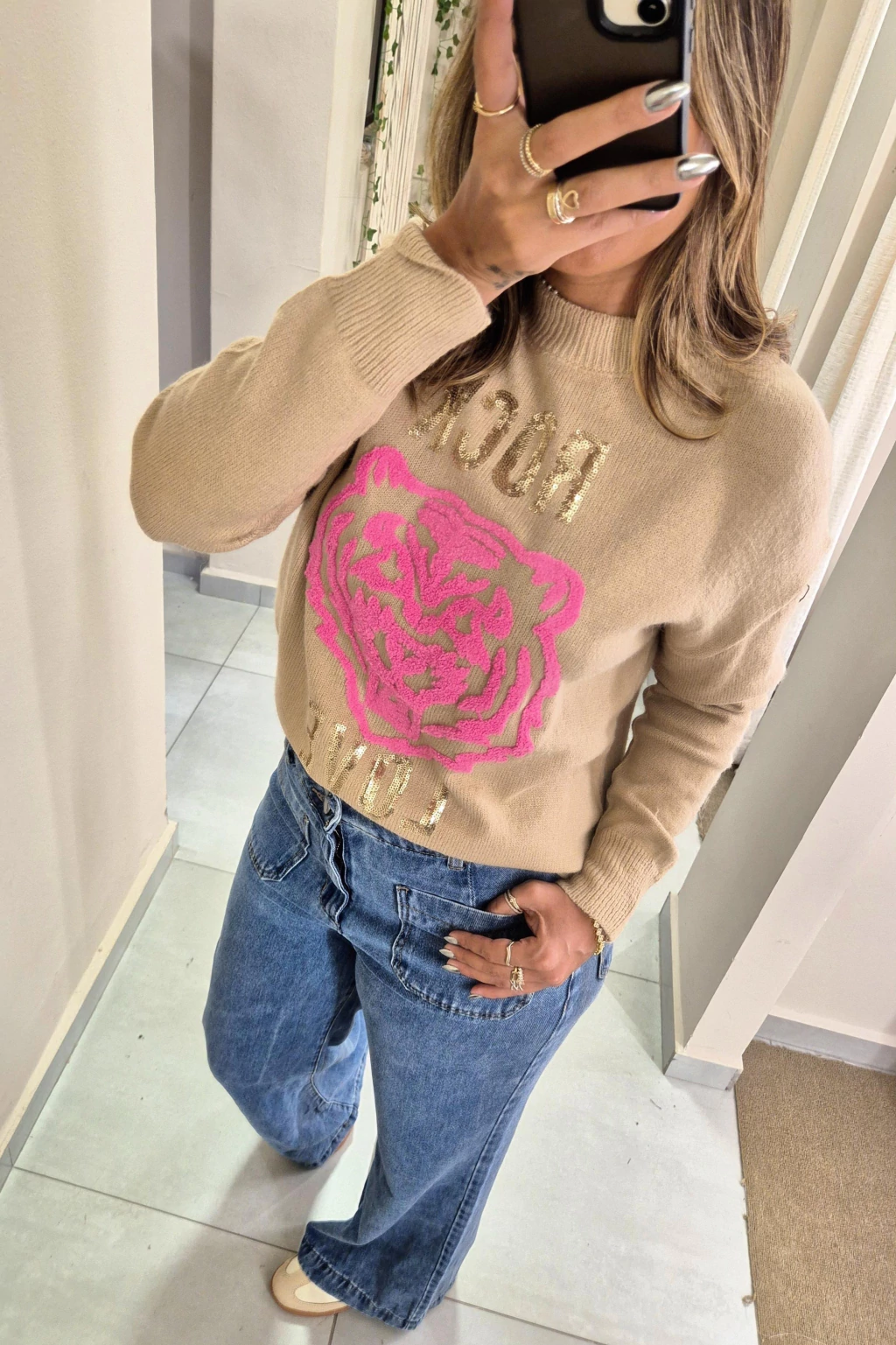 Blusa em tricot super estilosa com estampa frontal de tigre em rosa vibrante e bordado com paetês nas palavras “ROCK” e “LOVE”. O modelo tem gola redonda, mangas longas e caimento soltinho, garantindo conforto e personalidade ao look. Ideal para quem ama peças com atitude e um toque fashion. Perfeita para usar com jeans, calças de alfaiataria ou peças em couro.