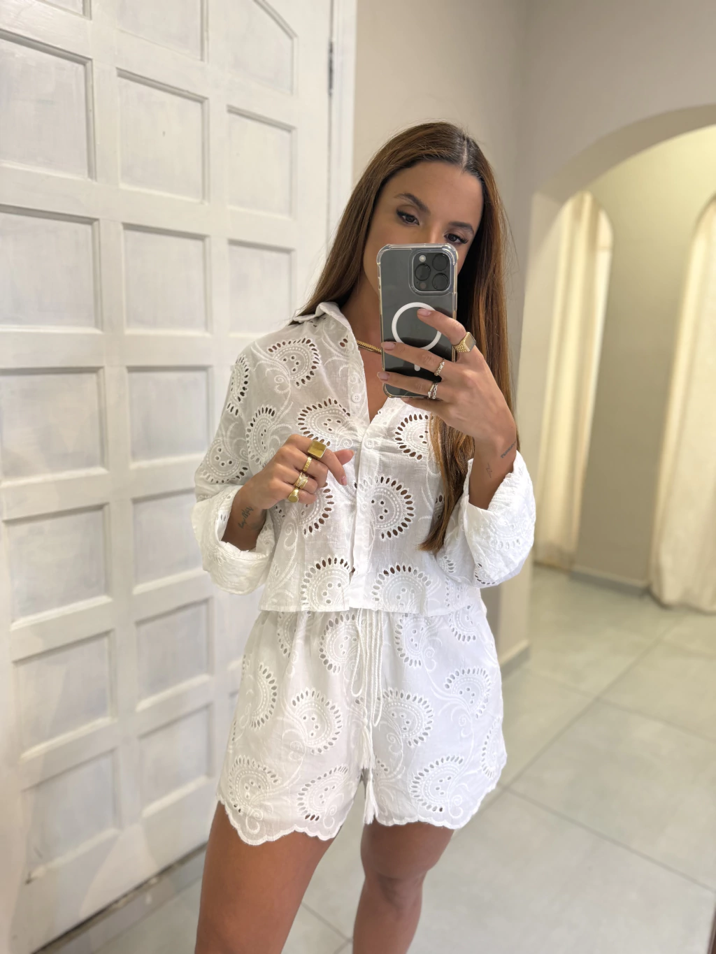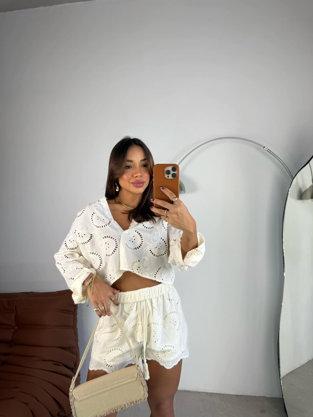 Camisa de manga longa com botões frontais e acabamento delicado, combinada com short de cós ajustável e detalhe em tassel, garantindo charme e conforto. O tecido leve e vazado traz frescor, perfeito para composições sofisticadas de verão ou produções à beira-mar.
