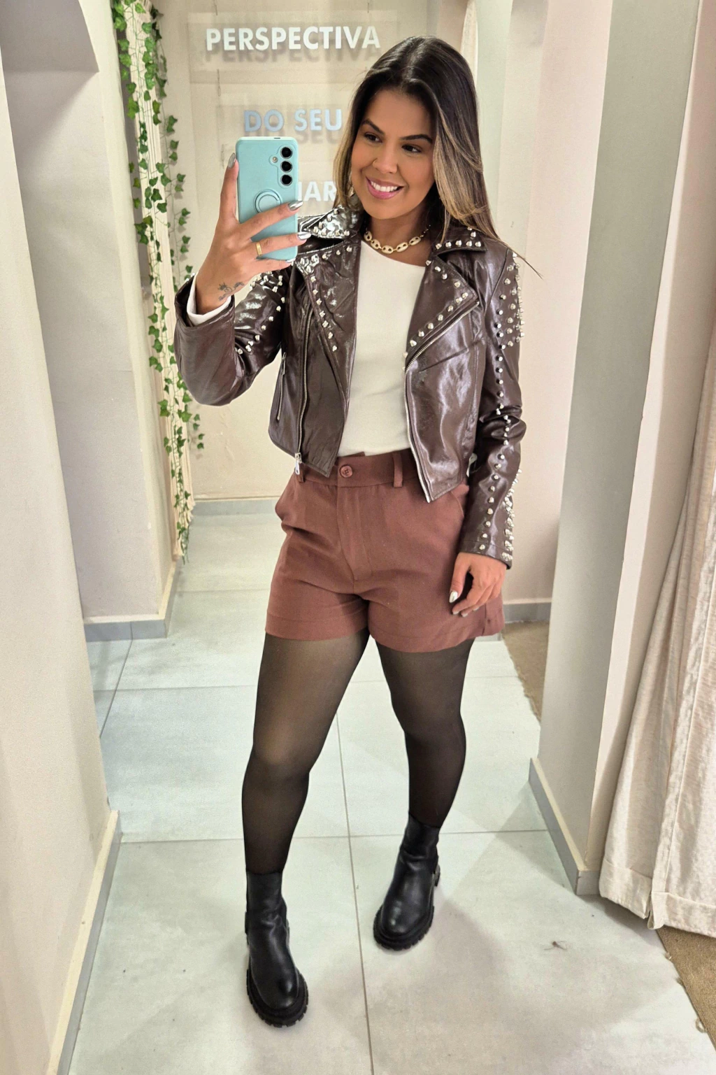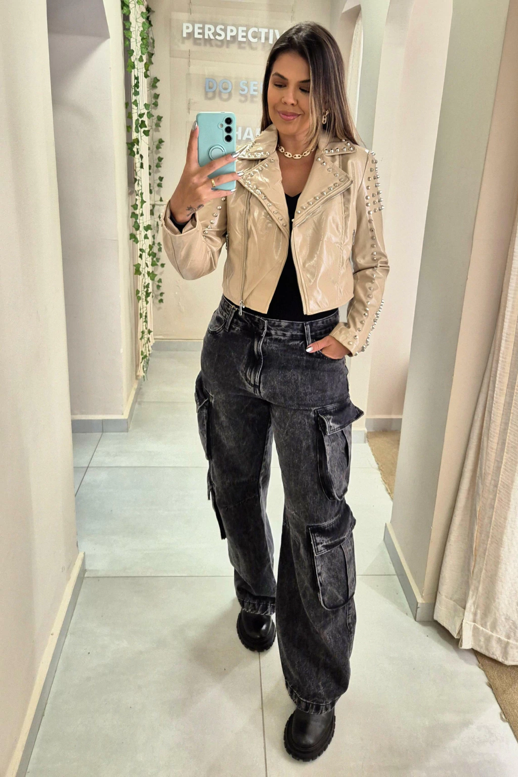 Um toque de atitude e sofisticação para o seu look! Esta jaqueta em tom bege é confeccionada em material sintético com acabamento brilhoso e traz aplicação de tachas metálicas nos ombros e mangas, adicionando um ar moderno e ousado. Possui modelagem cropped, zíper frontal e caimento impecável que valoriza a silhueta. Perfeita para compor produções estilosas, do casual ao urbano chic.
