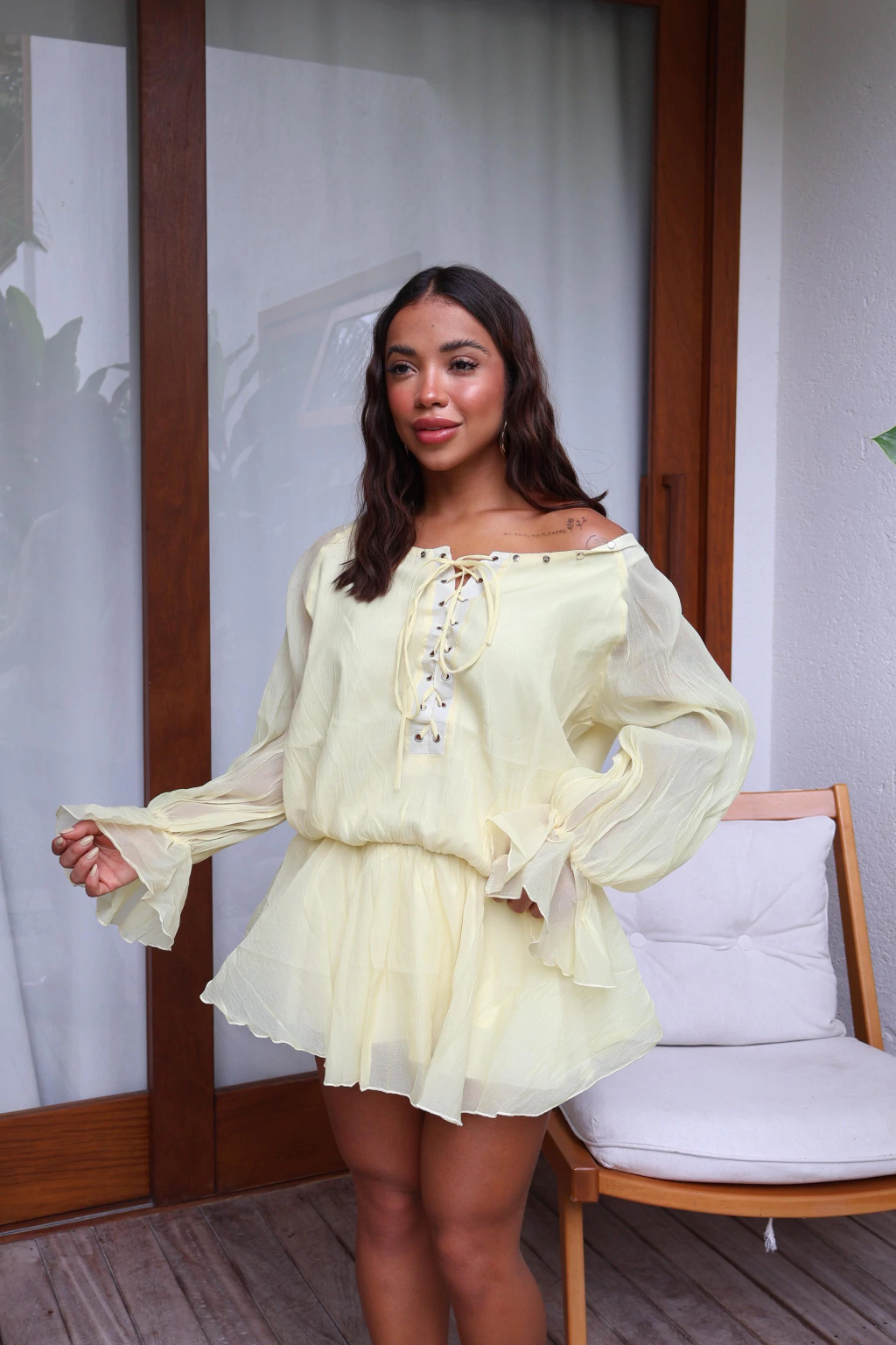 Vestido curto leve e delicado, confeccionado em tecido fluido com transparência suave. Modelo de manga longa bufante com detalhe de amarração frontal, cintura com ajuste que valoriza a silhueta e saia soltinha com babados, garantindo movimento e frescor ao look.