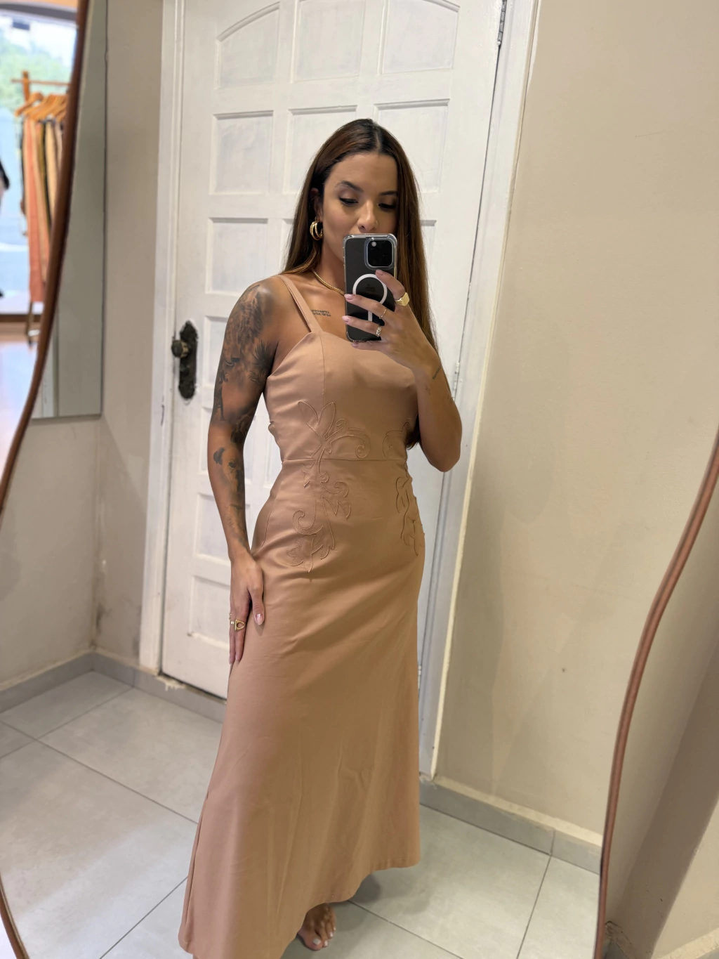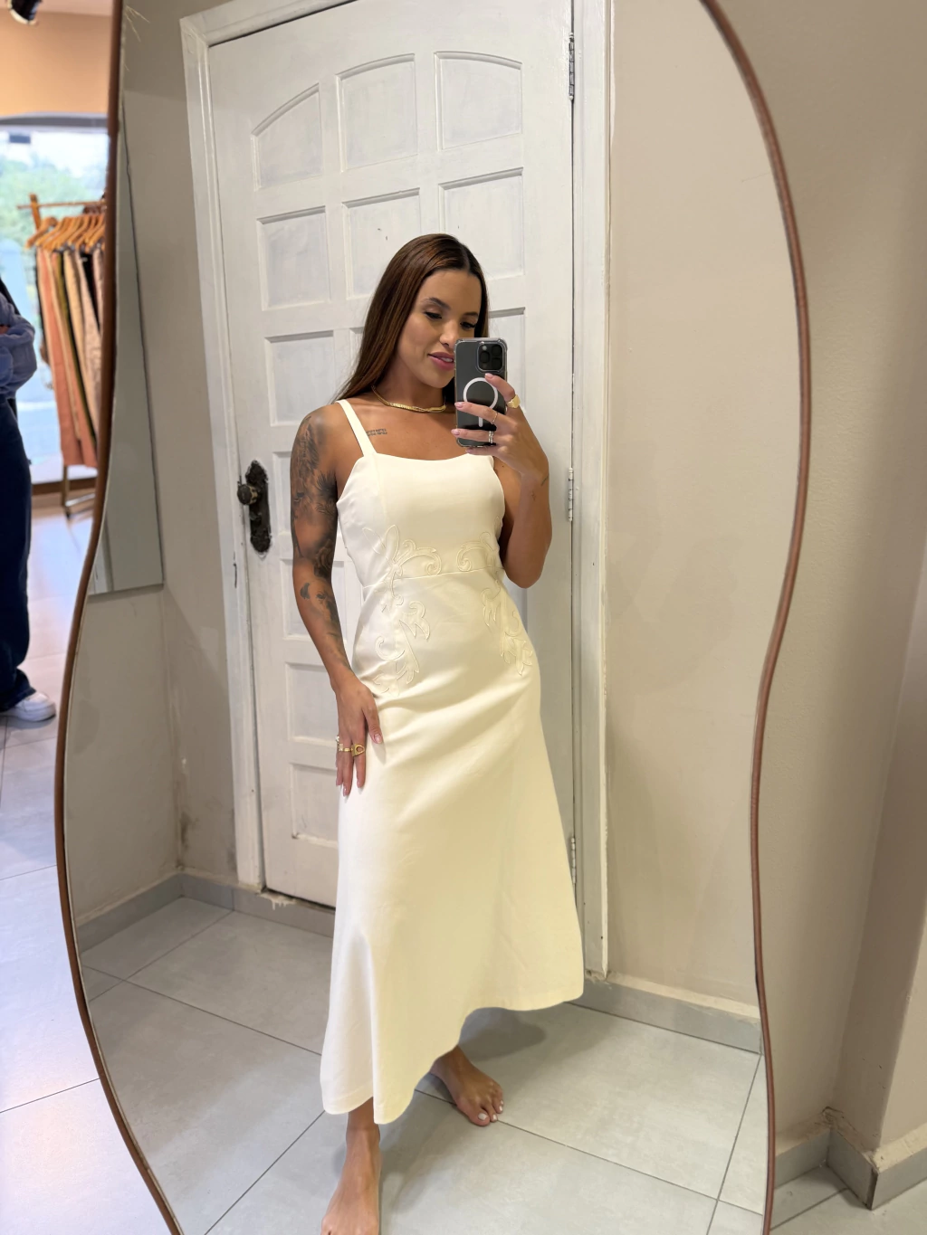 Vestido longo em tecido leve com modelagem fluida e detalhes bordados que trazem delicadeza e elegância ao look. ✨